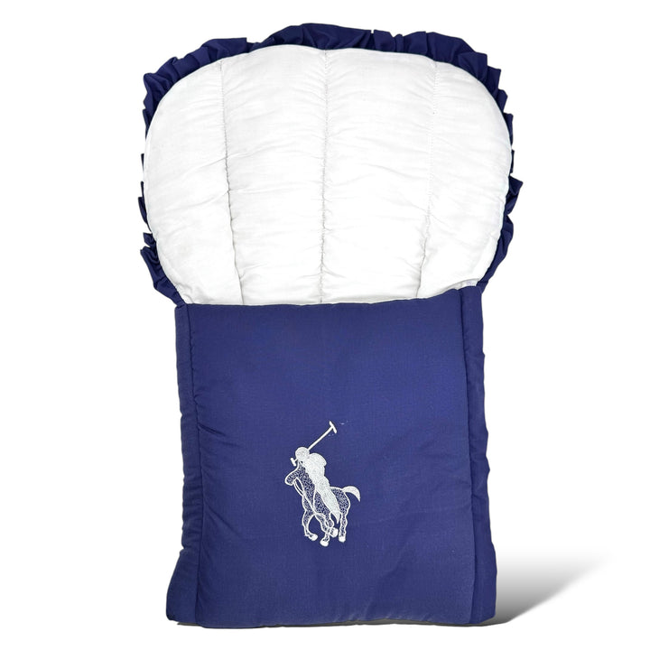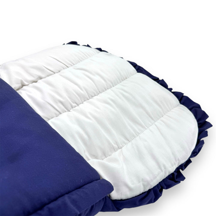"Wrap your baby in ocean-inspired cuteness! Our Comfy Carry Nest features frilly sides, a dolphin embroidery, and softness galore. Snuggle up and make waves with your little one!"