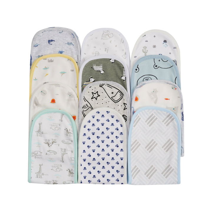 "Soft & absorbent burp cloths in cute colours & prints. Pack of 2 for easy rotation. Perfect for burping, drooling & snuggling!"