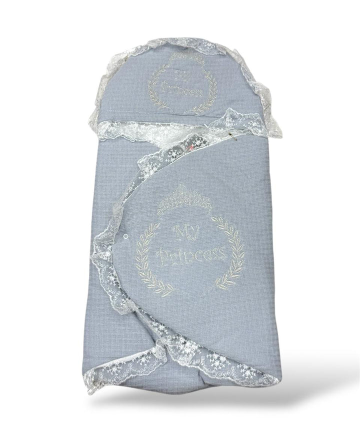 "Snuggle Swaddle Luxury! Our Comfy Carry Nest combines the coziness of a swaddle with fancy frills, delicate nets, and beautiful embroidery. Wrap your baby in elegance and comfort"